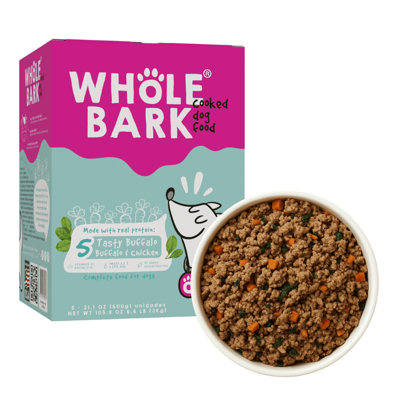 Huesos carnosos de búfalo y/o pollo, carne magra de búfalo, hígado de búfalo y/o pollo, banano y/o pera, papaya y/o piña, acelgas y/o espinacas, arándanos y/o remolacha, zanahoria, omegas 3, 6 y 9 (EPA y DHA).