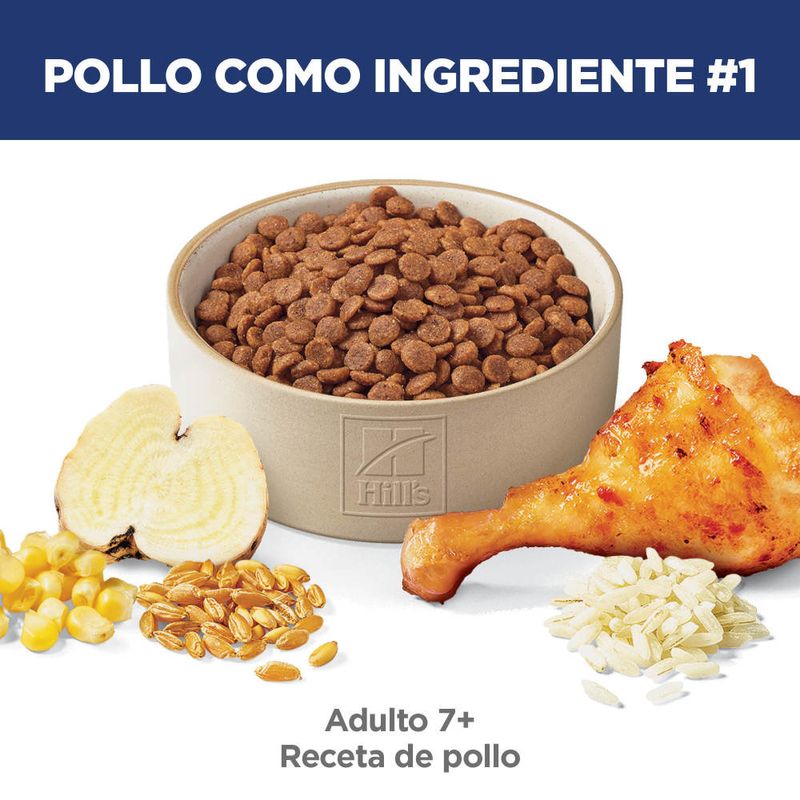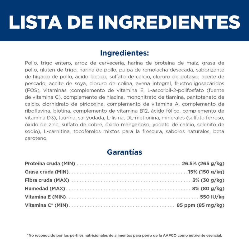 Pollo (carne, piel), trigo entero, harina de gluten de maíz, grasa de pollo, arroz de cervecería, pulpa de remolacha desecada, saborizante de hígado de pollo, sulfato de calcio, ácido láctico, cloruro de potasio, aceite de pescado, cloruro de colina, l-lisina, vitaminas (complemento de vitamina e, l-ascorbil-2-polifosfato (fuente de vitamina c), complemento de niacina, mononitrato de tiamina, pantotenato de calcio, clorhidrato de piridoxina, complemento de riboflavina, complemento de vitamina a, biotina, complemento de vitamina b12, ácido fólico, complemento de vitamina d3), fosfato dicálcico, sal yodada, taurina, minerales (sulfato ferroso, óxido de zinc, sulfato de cobre, óxido manganoso, yodato de calcio, selenito de sodio), l-carnitina, dl-metionina, fibra de avena, tocoferoles mixtos para la frescura, sabores naturales (romero, té verde, menta verde), beta caroteno, manzanas, brócoli, zanahorias, arándanos, guisantes verdes.