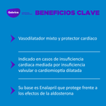 1. Incluye Benazepril, inhibidor de la ECA y vasodilatador mixto, para reducir la carga de trabajo cardíaco. 2. Contiene Espironolactona como protector cardiaco frente a los efectos de la aldosterona. 3. Recomendado en casos de insuficiencia cardíaca por insuficiencia valvular o cardiomiopatía dilatada.