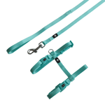 El kit incluye un arnés de nailon con diseño ergonómico en H, terminaciones reforzadas y dos broches de seguridad que permiten colocarlo sin pasar por la cabeza, adaptándose fácilmente al cuello y abdomen del gato.
