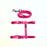 El kit incluye un arnés de nailon con diseño ergonómico en H, terminaciones reforzadas y dos broches de seguridad que permiten colocarlo sin pasar por la cabeza, adaptándose fácilmente al cuello y abdomen del gato.