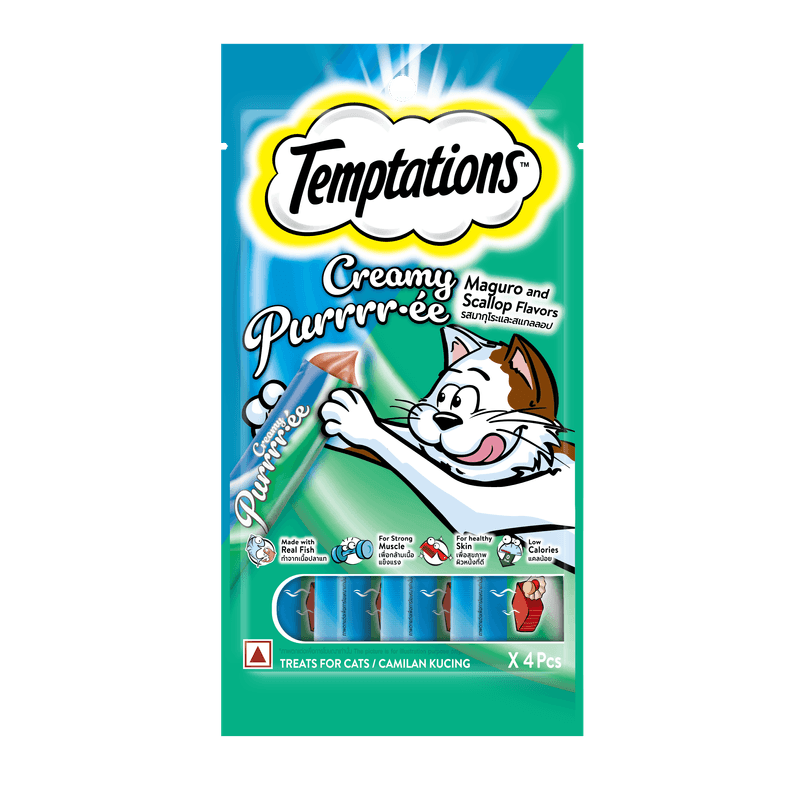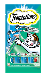 El puré cremoso Temptations™ es un snack lamible para gatos, diseñado para ofrecer una experiencia deliciosa y de conexión con tu felino. Elaborado con ingredientes reales como salmón, atún y pollo, brinda un sabor irresistible y una textura suave y cremosa que los gatos adoran.